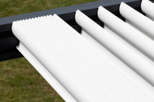 Lorsque le toit est fermé, la pergola bioclimatique B600 fonctionne comme les modèles précédents : des lames orientables sur leur axe permettent de doser les rayons du soleil selon vos envies.